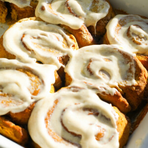 Savor every bite of these irresistibly sticky pumpkin cinnamon rolls this fall. They have a vibrant orange hue from real pumpkin purรฉe, and each swirl is packed with the warm, comforting flavors of pumpkin spice and cinnamon. The rich cream cheese filling is also infused with those same cozy spices, making every bite a celebration of the season. These rolls are the ultimate fall indulgence you'll want to enjoy all season long.