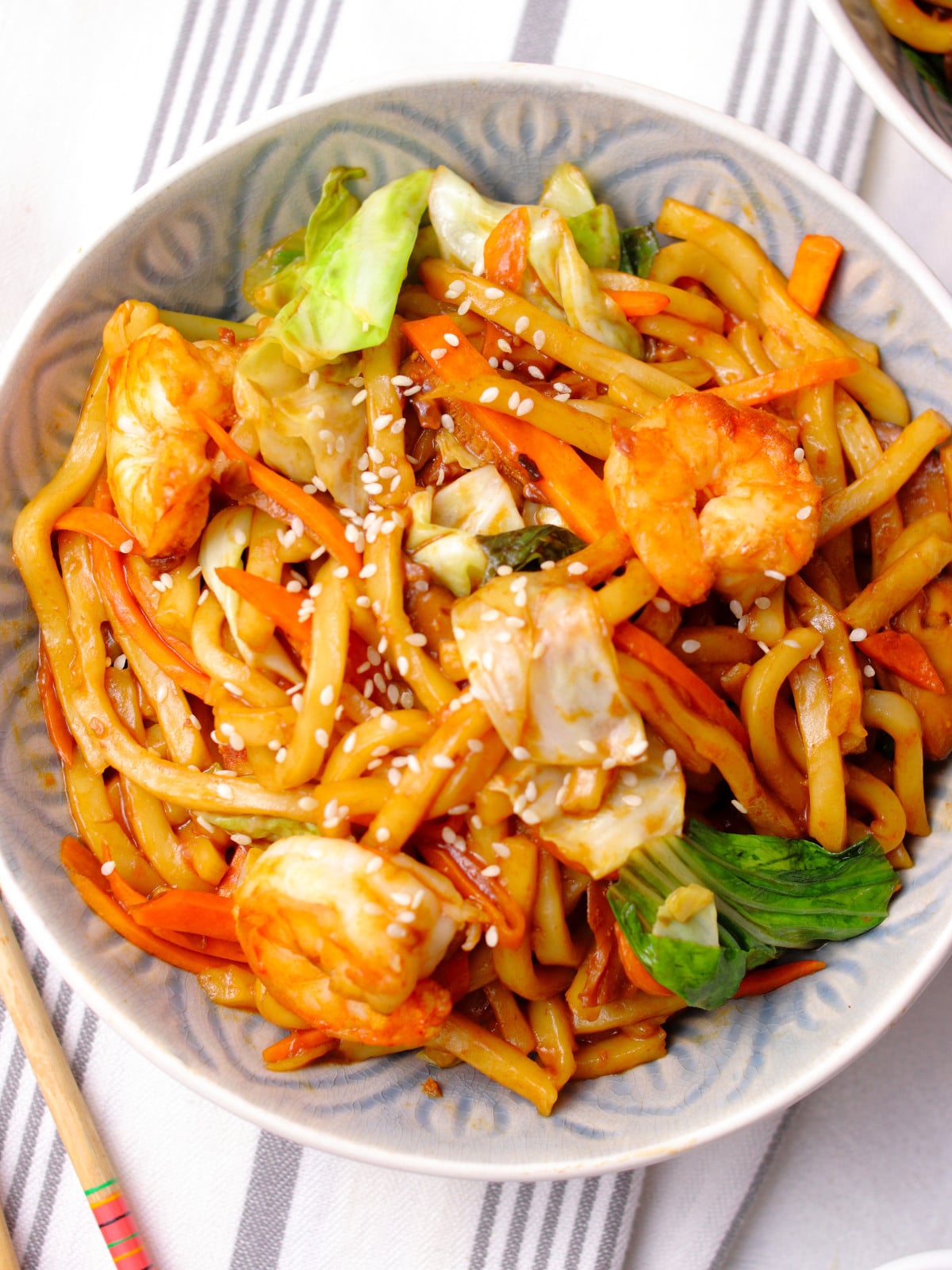 Make this delicious Japanese-style Shrimp Yaki Udon. It is made with udon, vegetables, shrimp, and mushrooms. Serve as dinner in 30 minutes.